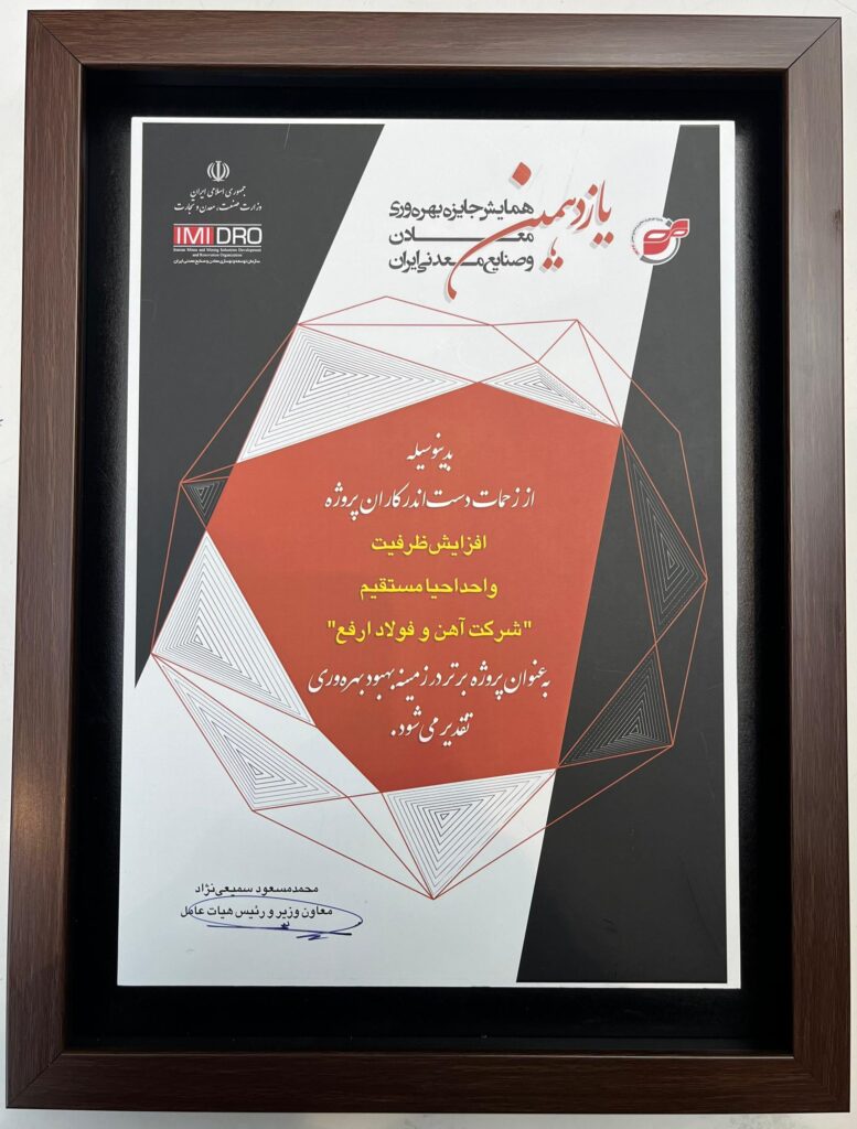 علاوه بر این، شرکت آهن و فولاد ارفع تقدیرنامه اجرای پروژه بهبود مربوط به افزایش ظرفیت واحد احیا مستقیم خود را دریافت کرد؛ پروژهای که در واحد آهن و فولاد ارفع اردکان یزد اجرا شده و نقش مهمی در ارتقای تولید و بهرهوری این مجموعه داشته است.