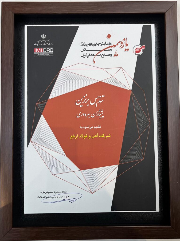 در این رویداد، شرکت آهن و فولاد ارفع موفق به دریافت تندیس برنزین پیشتازان بهرهوری شد؛ جایزهای که بر اساس عملکرد این شرکت در ارتقای کارایی و مدیریت بهبود مستمر اعطا میشود. در ادامه مراسم نیز از امین صفری، مدیرعامل شرکت آهن و فولاد ارفع، بهعنوان یکی از مدیران موثر در پیشبرد برنامههای بهرهوری تقدیر بهعمل آمد.