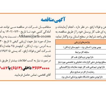 آگهی مناقصه انجام آزمایشات و معاینات دورهای طب کار پرسنلروابط عمومی۱۴۰۲/۰۷/۲۲شرکت آهن و فولاد ارفع ، در نظر دارد ، انجام آزمایشات و معاینات دوره ای طب کار پرسنل خود را از ... ادامه مطلب