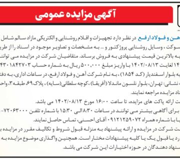 آگهی مزایده عمومی اقلام روشنایی و الکترونیکی مازادروابط عمومی۱۴۰۲/۰۸/۰۶شرکت آهن و فولاد ارفع در نظر دارد تجهیزات و اقلام روشنایی و الکترونیکی مازاد سالم شامل: لامپ های مختلف، سوکت، وسایل ... ادامه مطلب