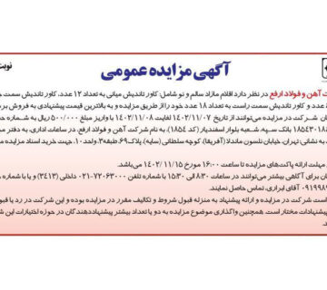آگهی مزایده عمومی اقلام مازاد سالم و نوAdmin۱۴۰۲-۱۱-۰۸آگهی مزایده عمومی اقلام مازاد سالم و نو ... ادامه مطلب