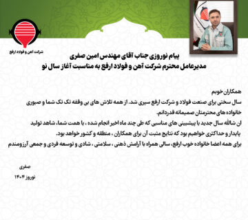 پیام نوروزی جناب آقای مهندس امین صفری مدیرعامل محترم شرکت آهن و فولاد ارفع به مناسبت آغاز سال نوروابط عمومی۱۴۰۴/۰۱/۰۱همکاران خوبمسال سختی برای صنعت فولاد و شرکت ارفع سپری شد. از همه تلاش های بی وقفه تک تک شما و صبوری ... ادامه مطلب