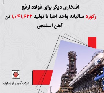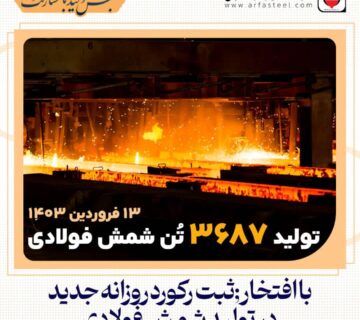 در راستای تحقق شعار منتخب سال با عنوان جهش تولید، اولین رکورد روزانه تولید فولاد ارفع در سال ۱۴۰۳ رقم خورد.روابط عمومی۱۴۰۳/۰۱/۱۵شرکت آهن و فولاد ارفع، در تاریخ ۱۳ فروردین ۱۴۰۳ با تولید روزانه شمش ریخته گری به میزان ۳۶۸۷ تن با افتخار ... ادامه مطلب